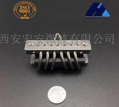 西安宏安微波有限公司為滿足工程應(yīng)用上的需要,不斷創(chuàng)新研究,開(kāi)發(fā)了一系列新型鋼絲繩隔振器。如GX型橡膠墊抗沖擊鋼絲繩隔振器,為加大鋼絲繩隔振器的阻尼,用橡膠等材料將鋼絲繩隔振器封裝起來(lái)(如圖b),可有效地衰隔振動(dòng)。最近,西安宏安微波有限公司又開(kāi)發(fā)出一個(gè)專利產(chǎn)品:橡膠墊鋼絲繩隔振器(如圖c),對(duì)GX型鋼絲繩隔振器的進(jìn)一步改進(jìn),將長(zhǎng)方體的橡膠墊改為與鋼絲繩緊密相貼的拱形橡膠墊,不僅對(duì)Pz方向進(jìn)行隔振緩沖,而且也保證了其它方向的隔振緩沖效果,可滿足高達(dá)100G以上的抗沖擊要求,適用于裝甲車輛、自行火炮、機(jī)載、車載、艦載等電子、機(jī)械設(shè)備、計(jì)算機(jī)與儀器儀表在高低溫、化學(xué)污染等惡劣環(huán)境下的隔振緩沖,導(dǎo)彈衛(wèi)星的運(yùn)載、導(dǎo)航與發(fā)射系統(tǒng)的安全防護(hù)以及各類工業(yè)動(dòng)力機(jī)械的工業(yè)降噪隔振等方面。