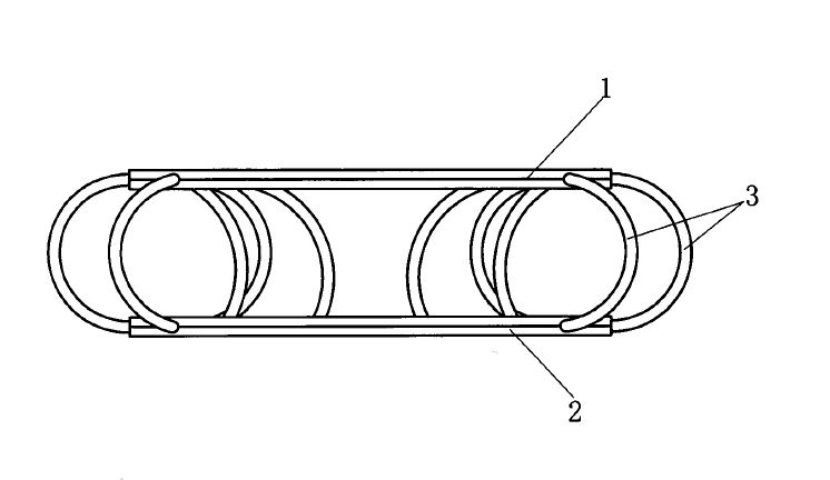 如圖所示,GRY系列輕型鋼絲繩隔振器包括兩片上夾板1及兩片下夾板2,上夾板1及下夾板2為圓環(huán)形,兩片上夾板1通過螺釘和卡條固定安裝在一起,兩片下夾板2通過螺釘固定安裝在一起,兩片上夾板1之間設(shè)有夾持鋼絲繩3的槽,兩片下夾板2之間也設(shè)鋼絲繩3的槽,鋼絲繩3螺旋環(huán)繞在兩片上夾板1與兩片下夾板2之間,鋼絲繩3穿繞在兩片上板1之間或兩片下夾板2之間時并夾緊在兩片上夾板1之間或兩片下夾板2,上夾板1與下夾板2的結(jié)構(gòu)及尺寸相同,上夾板1及下夾板2為不銹鋼鋼板,鋼絲繩3為不銹鋼鋼絲繩。